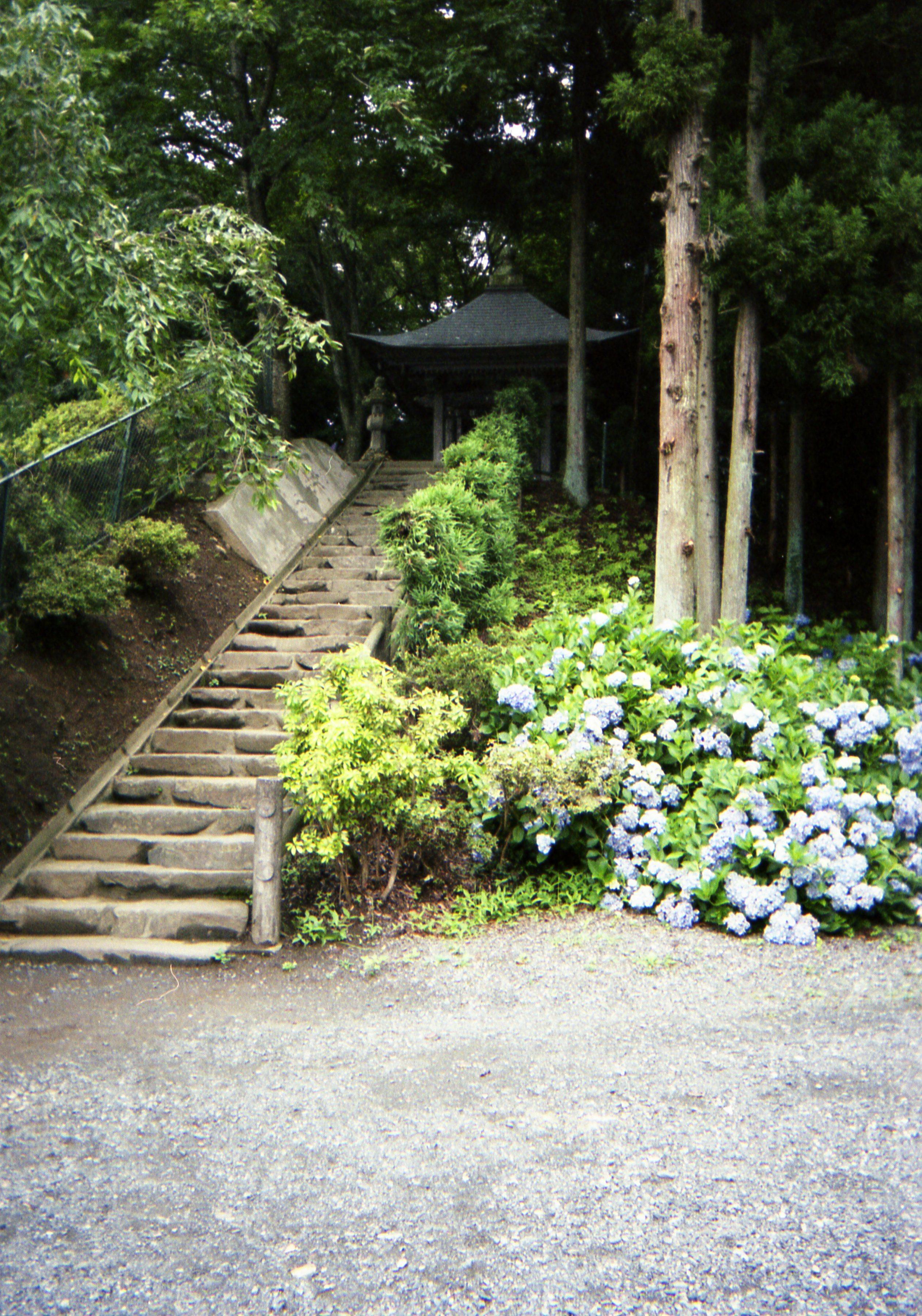 月見坂。 樹齢300年にも及ぶ鬱蒼とした杉並木に覆われた坂道を息を切らせながら登ってゆきます。運動不足を反省しつつ本堂を目指します。