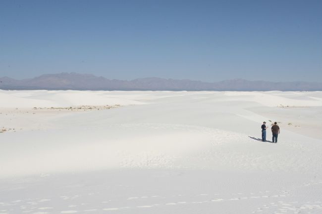 世界でも珍しい白い砂丘を是非とも見たくて遥々来ました。フェニックスから走行距離832Km。途中右往左往はしましたが…… ニューメキシコ州南端エルパソに近い場所に白く輝く砂丘があります。東京都面積の3分の一が全部“白い砂丘”です。自然の作り出した石膏(硫酸カルシウム)がむき出しです。砂丘の半分以上はミサイル射撃場です。自然を大切にするアメリカの国が軍の射撃場に利用しています。人類最初に長崎原爆を実験した場所でもあります。ビジターセンターは開園AM9:00(季節により違います)まだ開いていませんでした。
