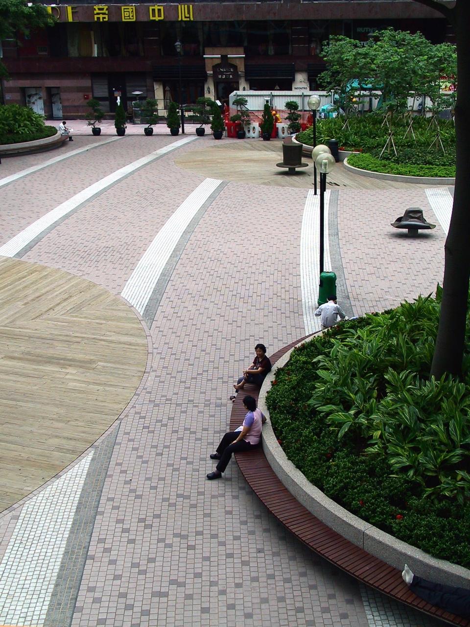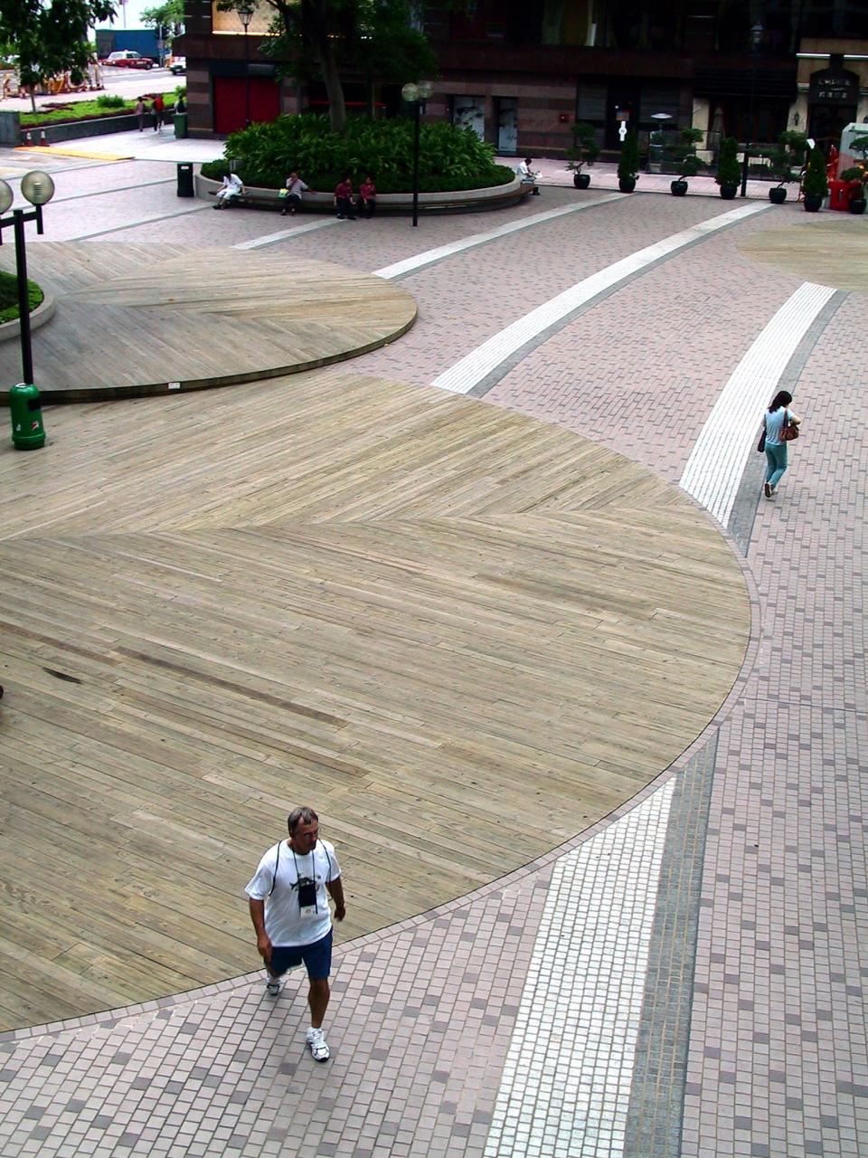 海へ向かう歩道橋の上から、帝国中心前の広場を望む。