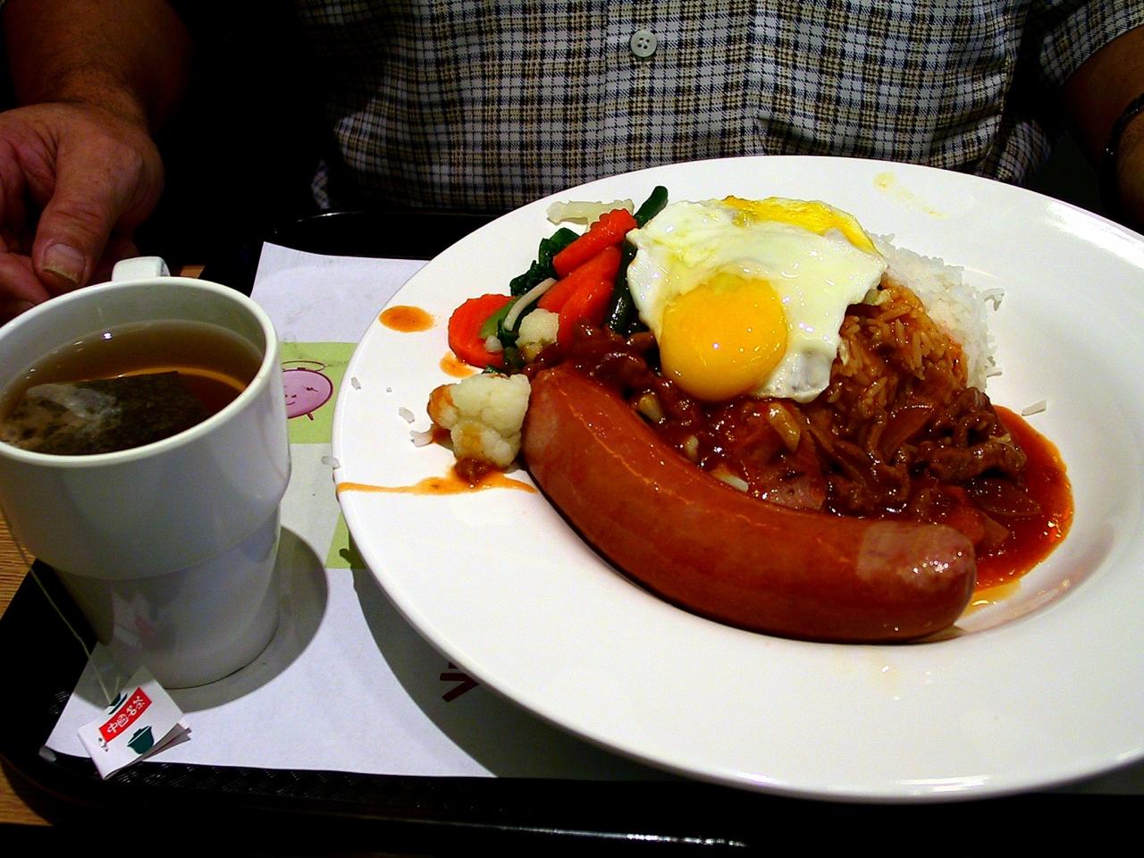 ハヤシライスに玉子がのっかっているご飯に、大きなウインナー付き。
