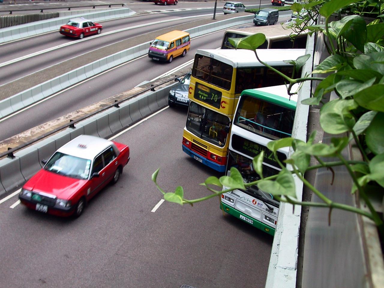 卑打道(Pedder Road)に掛かる歩道橋を進んで行くと、何やらバスが一台立ち往生している感じ。