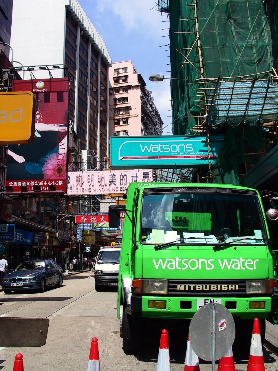 ワトソンズの看板は水色ですが、ミネラル配達の車は、ワトソンズウオーターのキャップの色なんですね。