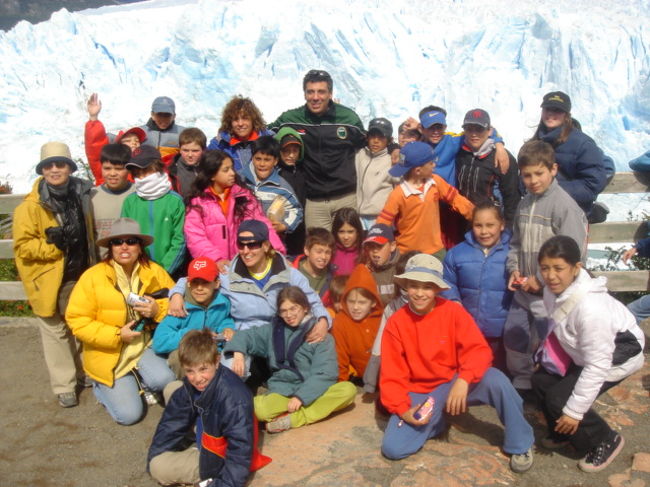 氷河をバックに子供たち