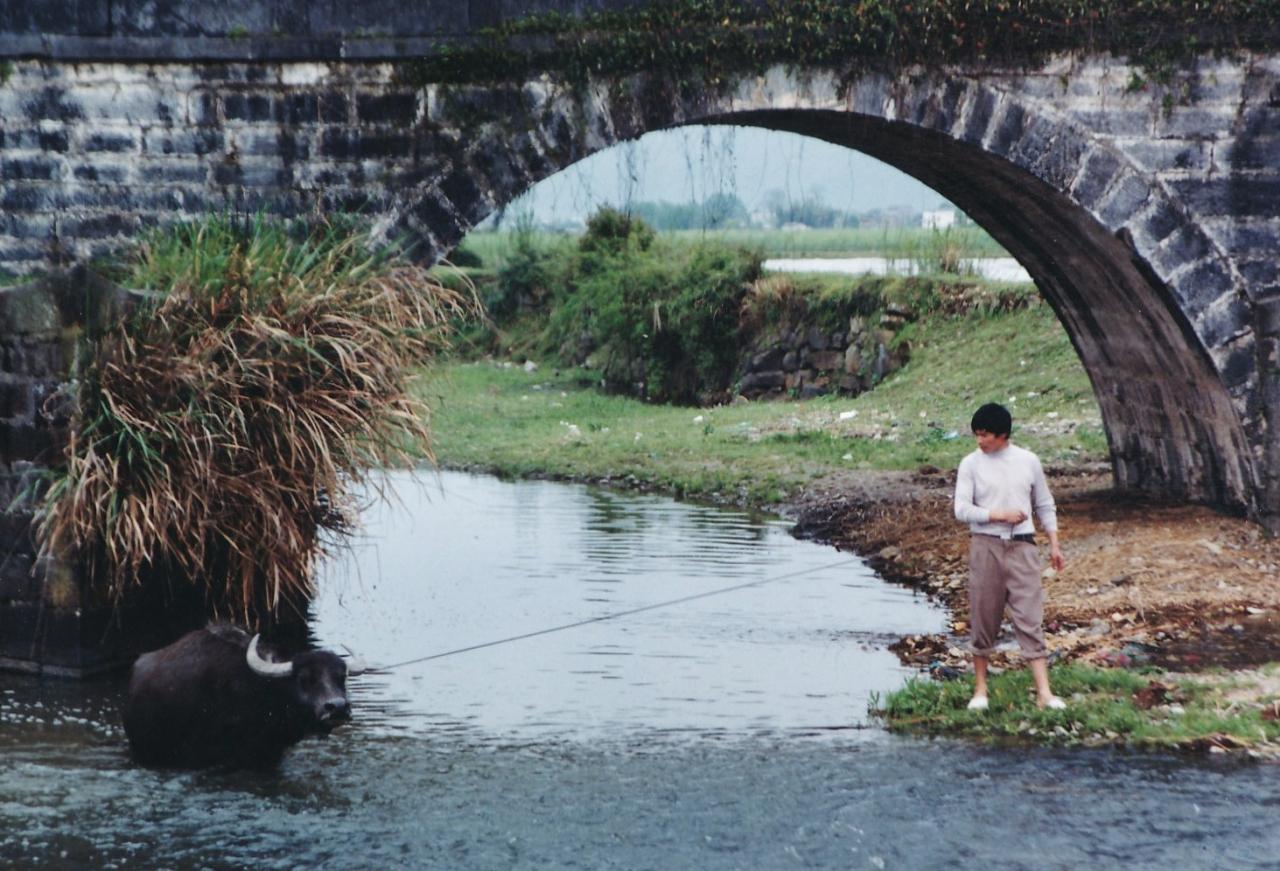 万松橋の石のアーチ、川の流れを渡る水牛、その水牛を引いてくる人。