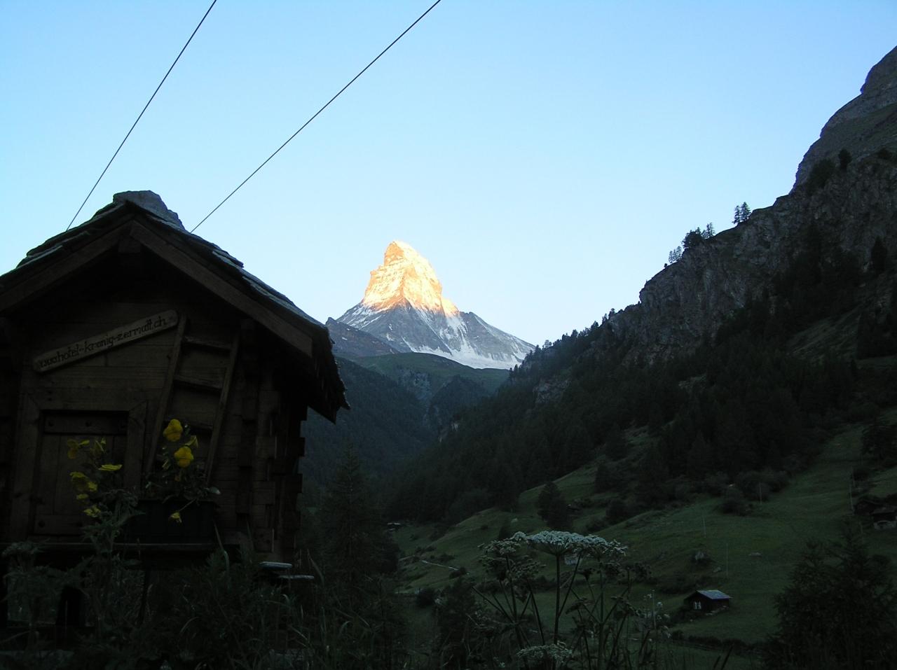 2006年7月1日(土)朝5時35分過ぎから川の左側の道をヴィインケルマンテンまで「マッターホルン」の朝焼けを撮りました。