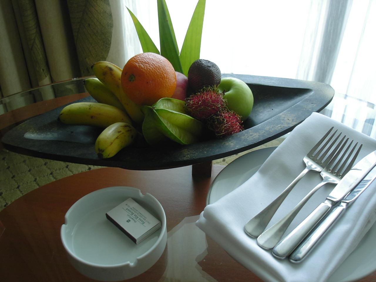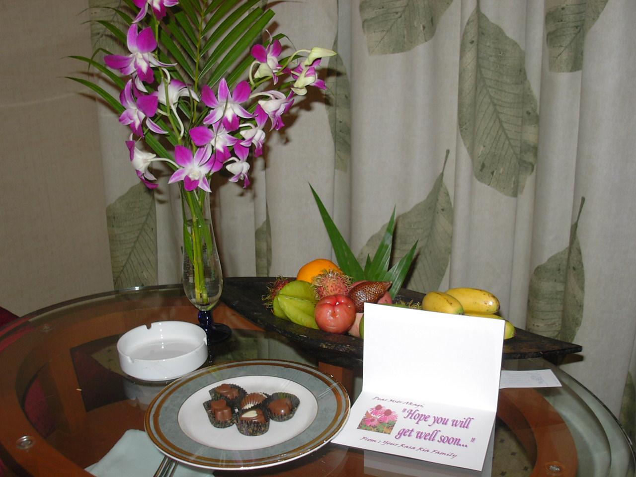 実は昼のスコールのあとに、卓球をしにゲームルーム(オープンエアー)に行ったら、床が濡れていたので息子が足を滑らせてアゴを切ってしまいました。ホテルの従業員が救護室に案内してくれた時に「濡れた床で滑って・・・」と話したのがマネージャーに伝わり「早く良くなって」のカードと共に上記の物が部屋に届きました。せっかくの旅行でけがをしたのは残念だったけど、ホテルの対応に感動(^・^)チュッ -