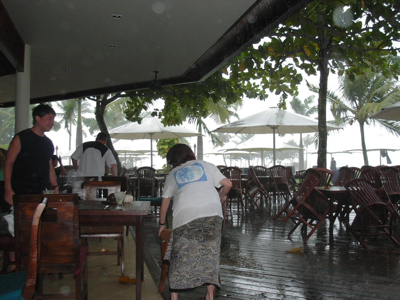 3日目の昼にスコール・・・プール横のレストランでランチをしていましたが、みなさんお皿を持って屋根があるテーブルまで避難しました。