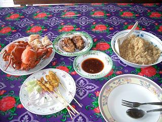 ボートに乗りながらマングローブを探検するのですが、こうもりのいる洞窟によったり、野生のサルにバナナをあげたり、オオトカゲを発見したりして楽しかった♪それから炭づくりをしている現地の人の生活を見学(実は現地の人は裕福になり、今はタイから出稼ぎに来ている家族が炭つくりをしているそうです・・・)→鷲の餌付け→蟹と魚釣りを体験しました。魚つりをしていると黒い雲がだんだん近づいてきて雷が鳴り響き、広いマングローブの真ん中にぽつんと私達のボートだけがいたのて゜雷が落ちないかと半泣き状態でした。その後スコールに遭遇しましたが、目も開けれないし、息も出来ないほどでした。そして水上コテージの食堂でランチをしました。焼き鳥!?とチャーハンと蟹料理がでてきました。美味しかったです!