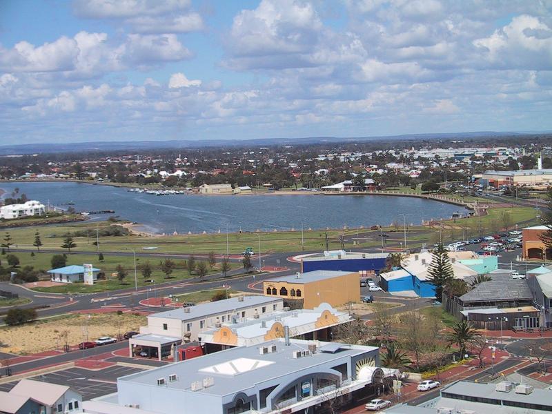 展望台から見たバンバリーの街。中央の白い建物が異彩を放っている。この建物はランドマーク的なもので、どこからでも見えた。