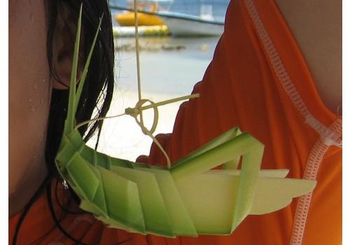 これはバッタ。ホント器用です。作るのも何日も考えて、イマジネーションを働かせるそうです。何度も何度も、どう編みこむかを頭の中でシュミレーションするそうです。