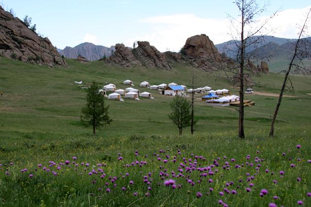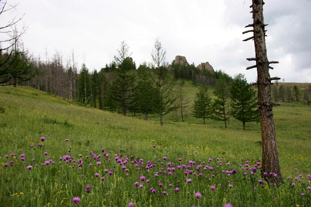 テレルジ国立公園の岩山風景・・テレルジ国立公園は岩山風景が楽しめる。緑の続く山々や草原の中に忽然と姿を現す色んな形をした岩、岩。人の顔や動物の姿などに似たものもある・・。ドウガノハットに比べると、どちらかと云えば男性的な雰囲気を持っている。宿泊したゲルの裏山に登ればまた違った美しい風景が見られる。