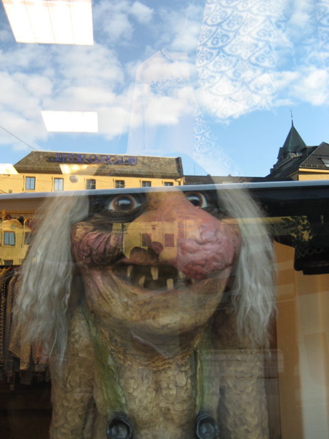 2006年8月16日出発、ノルウェー、スウェーデン、フィンランド8日間のツアー。まずはオスロ観光から始まります。ホテルの隣にノルウェーセーターなど売っているお土産屋さんがありました。そのショーウインドーに北欧神話に出て来る怪物(?)のトロール人形を発見!パパに似ているような、、、。と言ったら「ぼくはこんなに歯が抜けていない」ですと、、。失礼しました。鼻水もたらしていないものね。