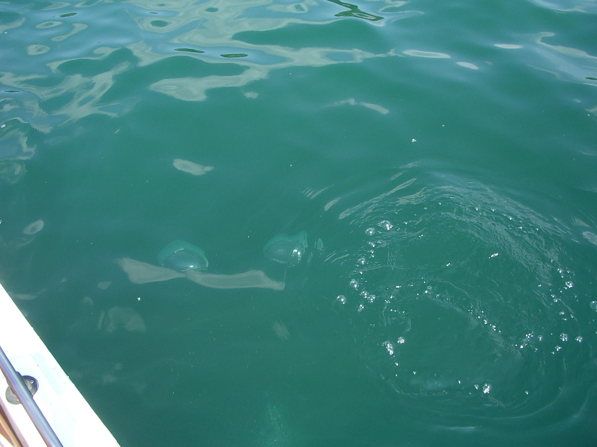 ・・・と思ったら、ボートの下から怪しい音と大きな泡が(驚)
