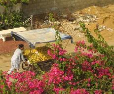 果物売りの屋台車の向こうに見えるのは我が家の前の向こう側。