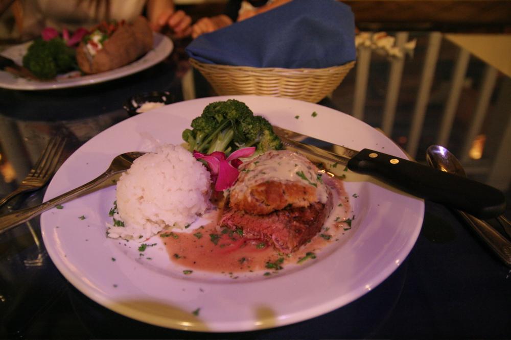 起きると4時間ぐらいねていてもう19時すぎ。ごはんを食べないと行けないので、知り合いに薦められたキングスショップにあるステーキハウスへ。ホテルのロワーロビーから15分おきに出ているシャトルバスでキングスショップへ。シャトルバスはキングスショップとの往復しかしないのに一人1$とられこれまた釈然としない気分。ショッピングセンターに行くバスぐらい無料にすればよいのに。