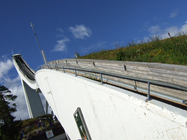 秋空にくっきりと浮かぶジャンプ台。入り口付近にはラージヒルジャンプと滑降の体験できるアトラクションがあった。100クローネくらいだった?で体験した。外で見ているより怖くなくて面白かった。