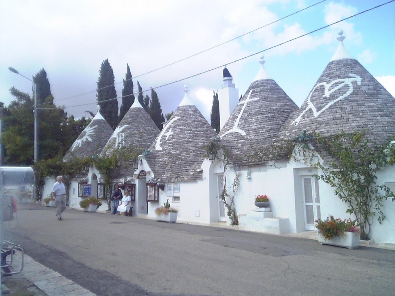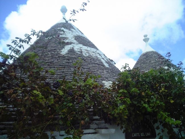 真っ白い壁&円錐状の屋根。トゥルッリはとってもかわいらしく、青い空にとっても映えてる。土産やも多く、日本人観光客も多いのか、日本語で書かれた看板もちらほら。ん〜親切なんだろうけど、ないほうが風情があって良い気がする。