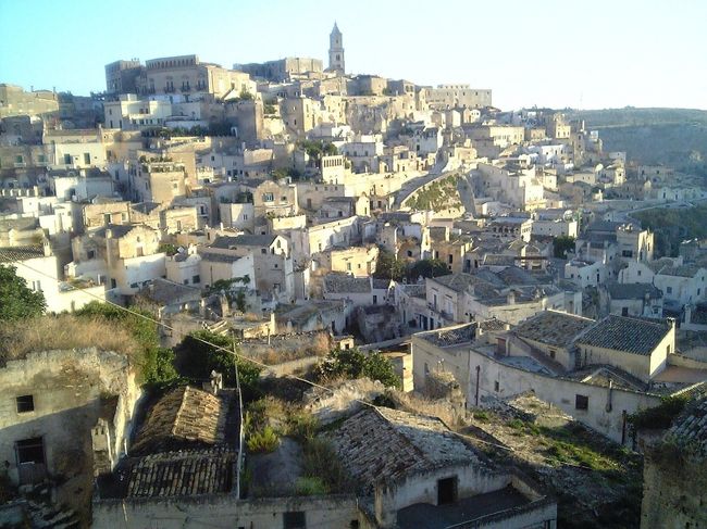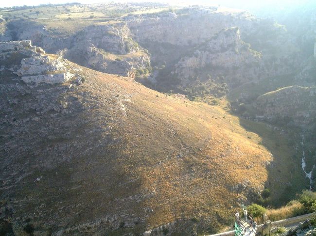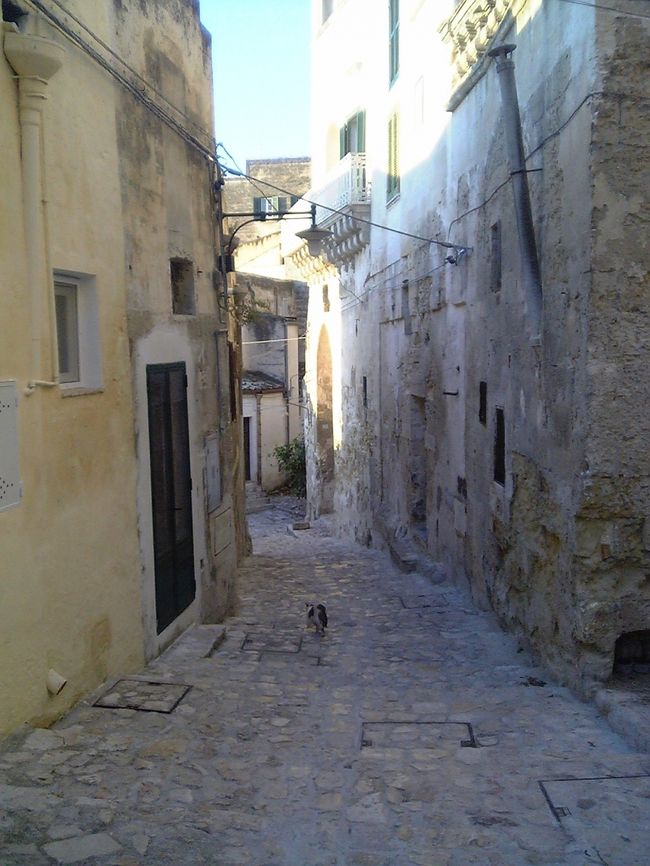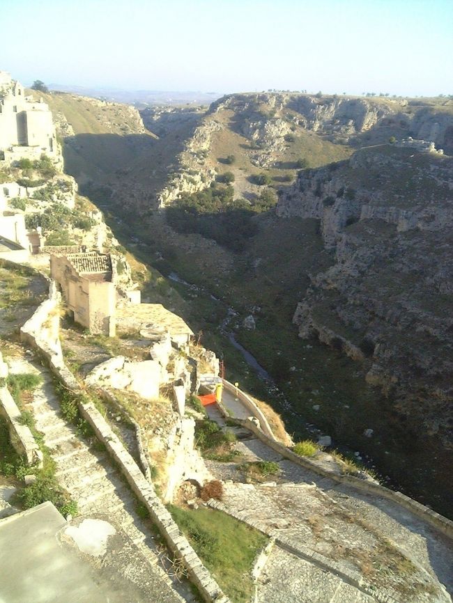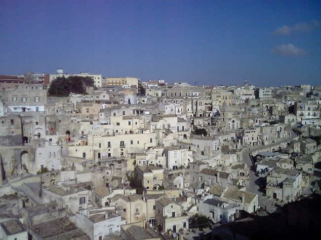 再びバーリに戻り、そこから洞穴住居(サッシ)のマテーラへ。またまたおんぼろローカル電車で向かう。晴れた青空と南イタリアの乾いた風が車内に入ってきて、とても気持ちよい。夕方マテーラに到着。とりあえず、市街地の方へ向かう。