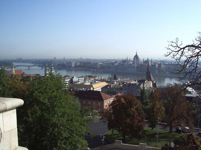 ブダの丘から見るペスト地区。ドナウ川の向こうに国会議事堂が見えます。