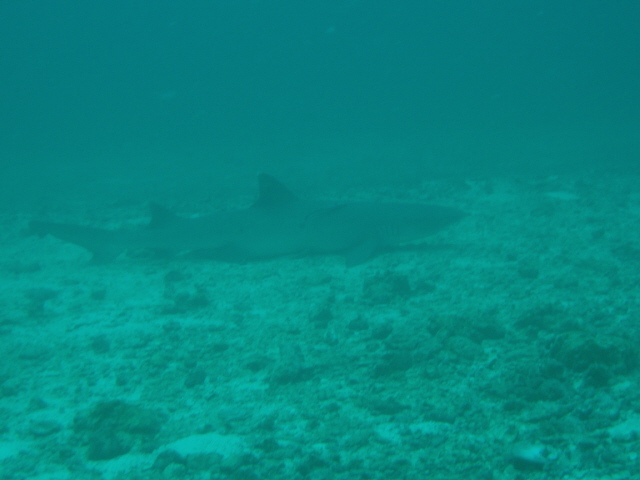 Gato はトンネルがいっぱいある地形ポイントで、穴の中にかなり大きなネムリブカが寝ています。こいつは、普通の砂地に寝ていました。私達が近寄ると、こいつにくっついているコバンザメのほうがかなりあせってて、こいつはかなり近づくまで気づきませんでした。