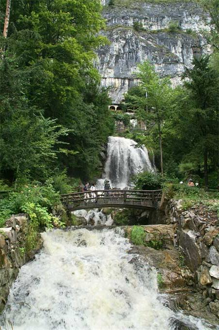 岩壁から流れが出る所が洞窟の入口でそこにはテラスのあるレストランなどの建物がある。