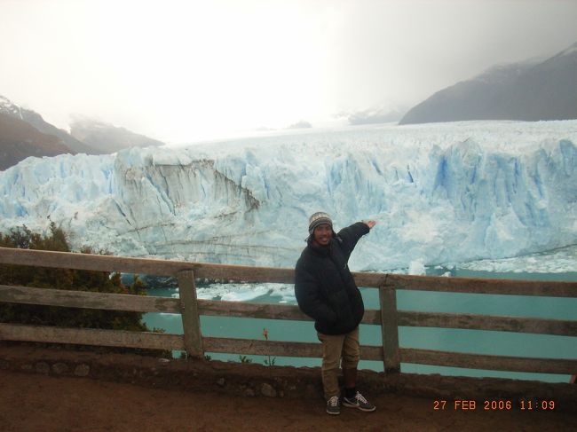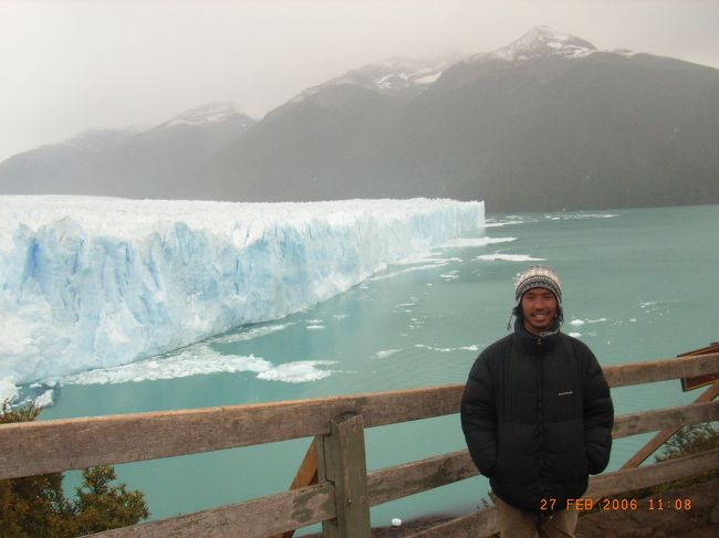今日は朝6:45分に起き、朝食を食べてバスに乗る。今日はアルゼンチンはエル・カラファテという氷河のある国立公園に行くのだ。ここエル・カラファテにはロス・グラシアレス国立公園がある。ここには南極、グリーンランドに次ぐ面積の氷河があり、気温が高いこともあって氷河の崩落が見られるのだ。ペルーのナスカの地上絵、マチュピチュ、チチカカ湖、ウユニ湖と南米のクライマックスを足早に見てきて、今日は地球の大自然、氷河を生で見る。心はワクワクしっ放しだった。 バスで1時間半程走って、チリを出国し、アルゼンチンに入国。アルゼンチンの白と水色の国旗が出迎えてくれる。エル・カラファテまでは思っていたよりも長く時間がかかり、車内では寝たり窓の外の雄大な景色の連続を眺めていた。ボリビアの満天の星の下で“こえだめ”に落ちて、ズボンと靴が臭っていた(2回洗い、よく乾かしたのだが)ので、ブルガリの香水を吹きつける。 午後3時30分過ぎ、エメラルドのアルゼンチーノ湖の先に想像を超える青の塊が姿を現す。「すごい!」やはり写真は写真でしかない。