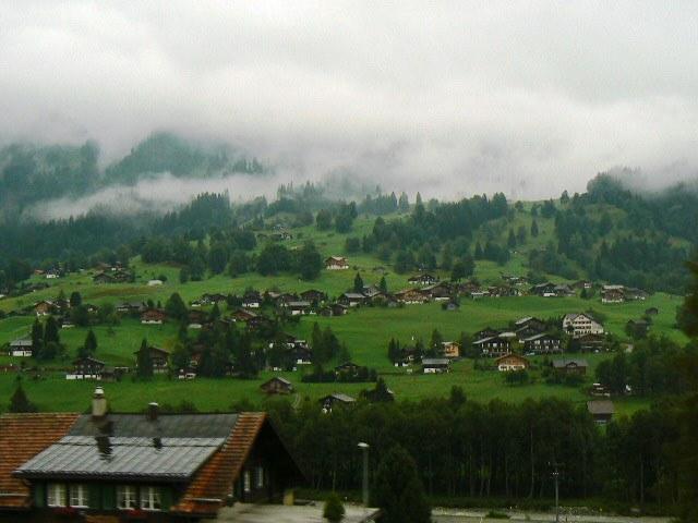 バスがインターラーケンに向かって走り始めたとき、雨滴がガラス窓をたたき始めた。