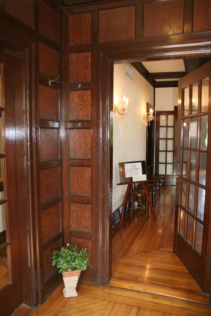 エントランス、グリーンの窓枠がシックでお洒落ですね。