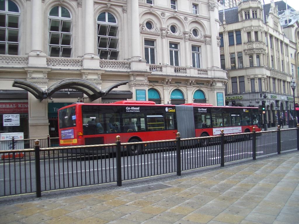 ロンドンと言えば2階建ての赤いバスですけど、2両編成の赤いバスも結構走ってますよ。どういう使い分けされてるのかよく分らんけど。