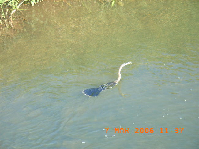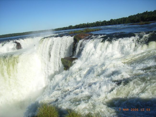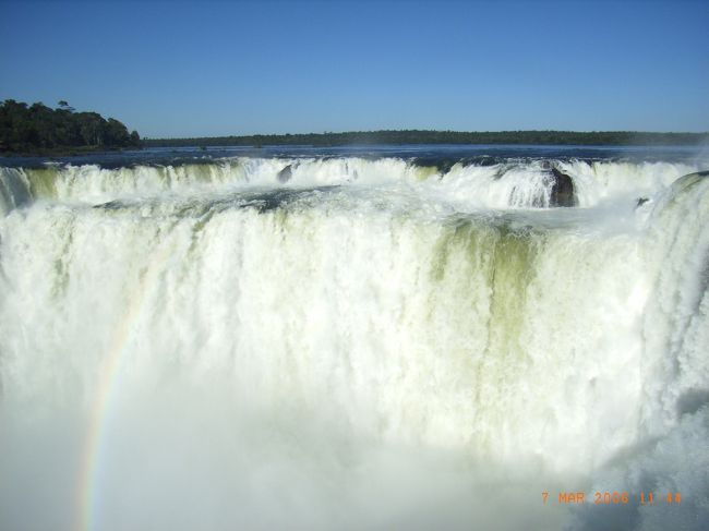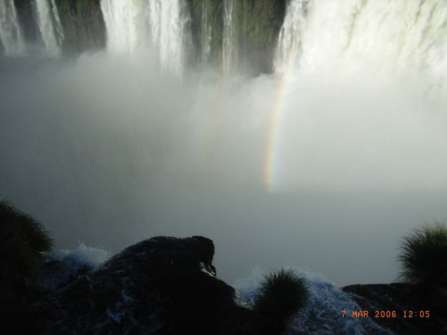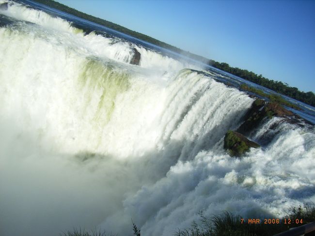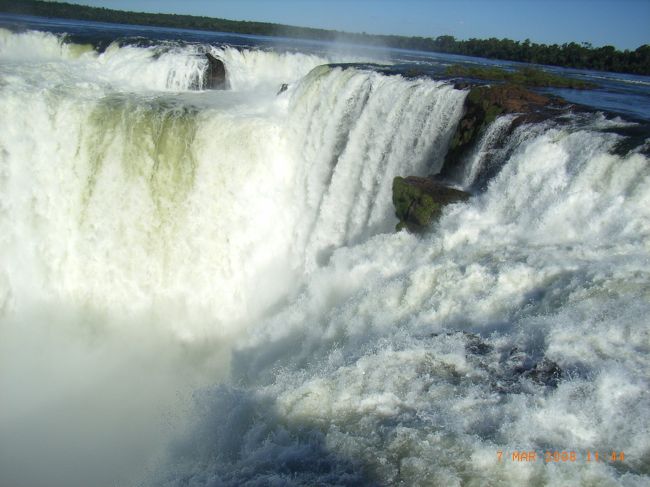 その後、遊歩道を歩いていると、石橋が「うお~~~~~!!!」とでかい声をあげる。振り返ると50cmくらいはあるだろうアナコンダが地をはっていた!それはおそらくイグアナだろうがとても巨大だった!それから滝のふもとの安全地帯で泳いでから再び列車に乗り、イグアスの滝最大のクライマックスである悪魔ののどぶえの近くへ行く。列車を降りてから20分程遊歩道を歩いていくて、轟音とともに、巨大な「裂け目」が遊歩道の両側を流れる水面に出ていた。近づいていくにつれて音量は増していく。「ごーーーーーーーー!!!」それははるかに想像を超えたスケールの滝だった。「すごい!」これほどまでか、イグアス!