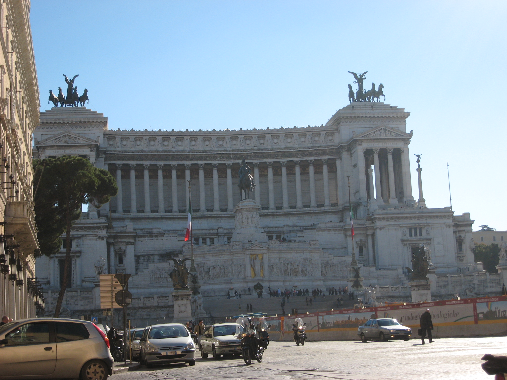 見えてきたのは、V・エマヌエーレ2世記念堂。この記念堂は完成した当時は地元の人に、評判が悪かったそうです。遺跡や古い建物の多いローマには合わない。。。とか。