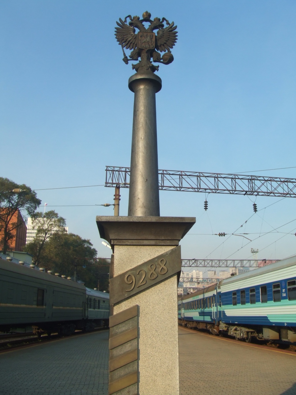 写真は、シベリア鉄道駅のモスクワまでの距離数を示すモニュメント。