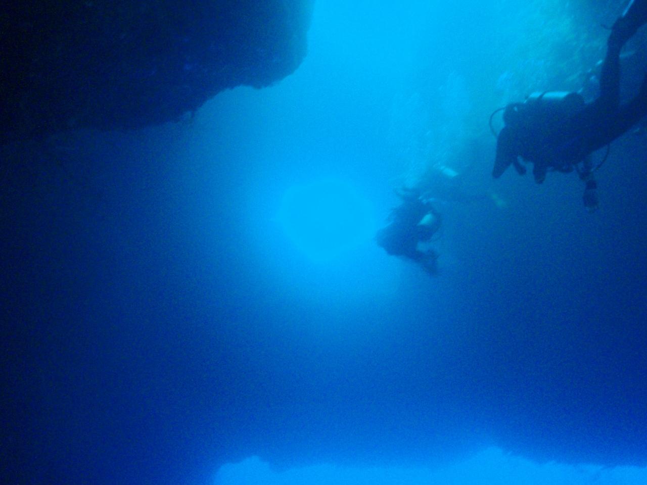 ダイバーのシルエットは想像をかき立てられて面白い、何を考えながら潜ってたんだろうなって。これはガイドがゲストに次の方向を示しているところかな・・、「左上の穴から出ます」と。左下にはそんな様子を撮影するダイバーのシルエット。 -