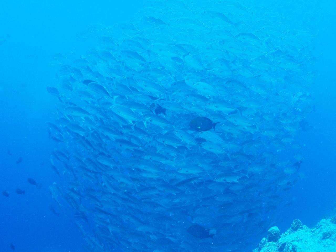 やがてギンガメアジの渦は一塊になり巨大な球体へ・・。渦を巻いたり球になったり、その様は一つの意思を持った巨大な生き物のよう。