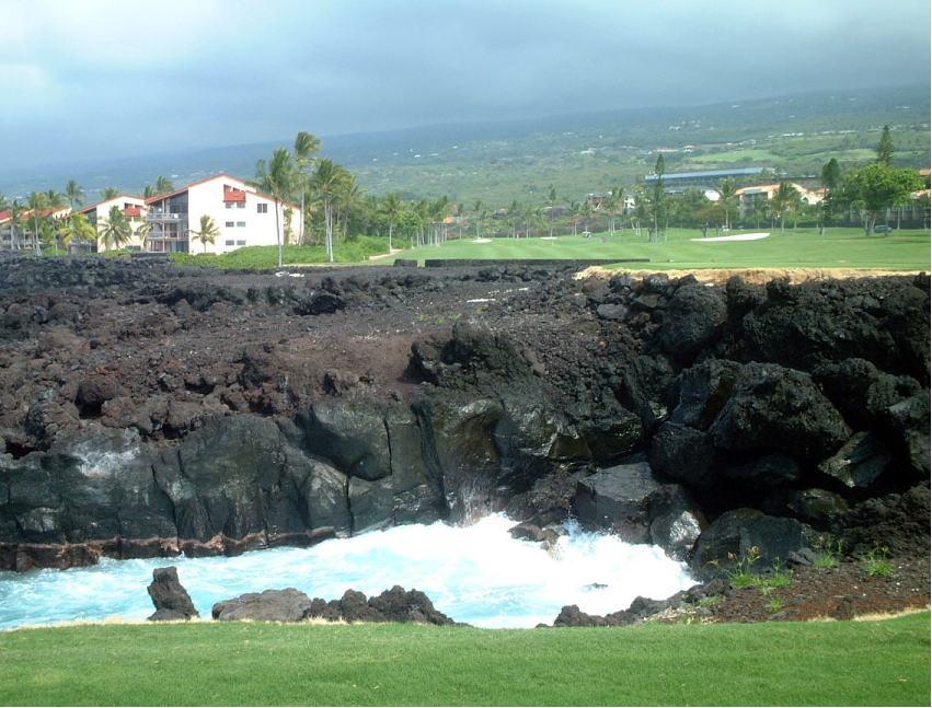 オーシャンコースは、海岸沿いにレイアウトされていて、フラットで広いフェアウエイを持つ。ハワイ島のコースの特徴のひとつである真っ黒い溶岩が各ホールを取り巻き、芝生の緑、溶岩の黒、そして大海原の青色のコントラストが美しい。海沿いのホールでは、フェアウエイの脇に太平洋のうねりが打ちつけ、波しぶきが飛び散る。椰子の木がハワイらしい雰囲気をかもし出しているが、きれい過ぎるレイアウトが、章くんには少し物足りない。