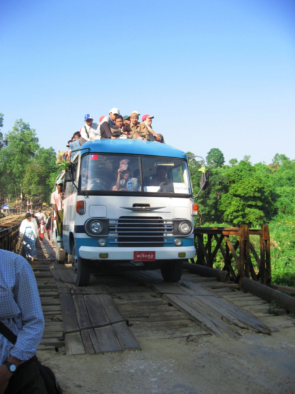 写真はそのバス。満員の乗客が乗ったままだと橋が崩壊する危険性があるため、車内の人はいったん降りて先に進み、ぎしぎしと音を立てながらそろりそろりと渡ってくるバスを待つ。