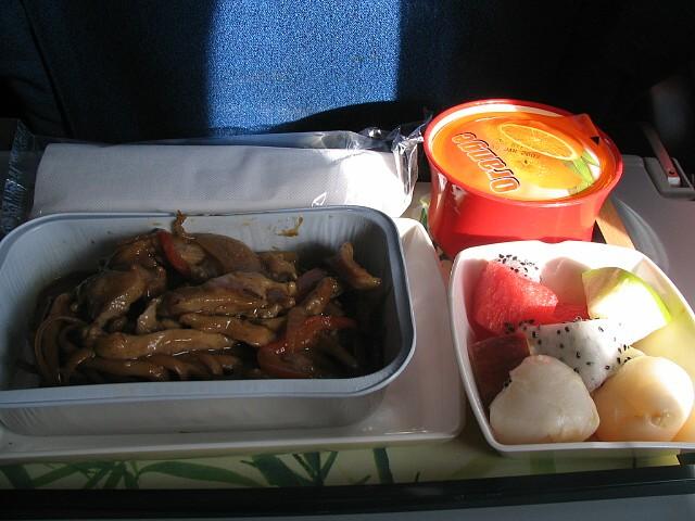 ここで1回目の機内食。肉入りソバ。肉はまあまあ美味しかったんですが、ソバはベチャベチャ。