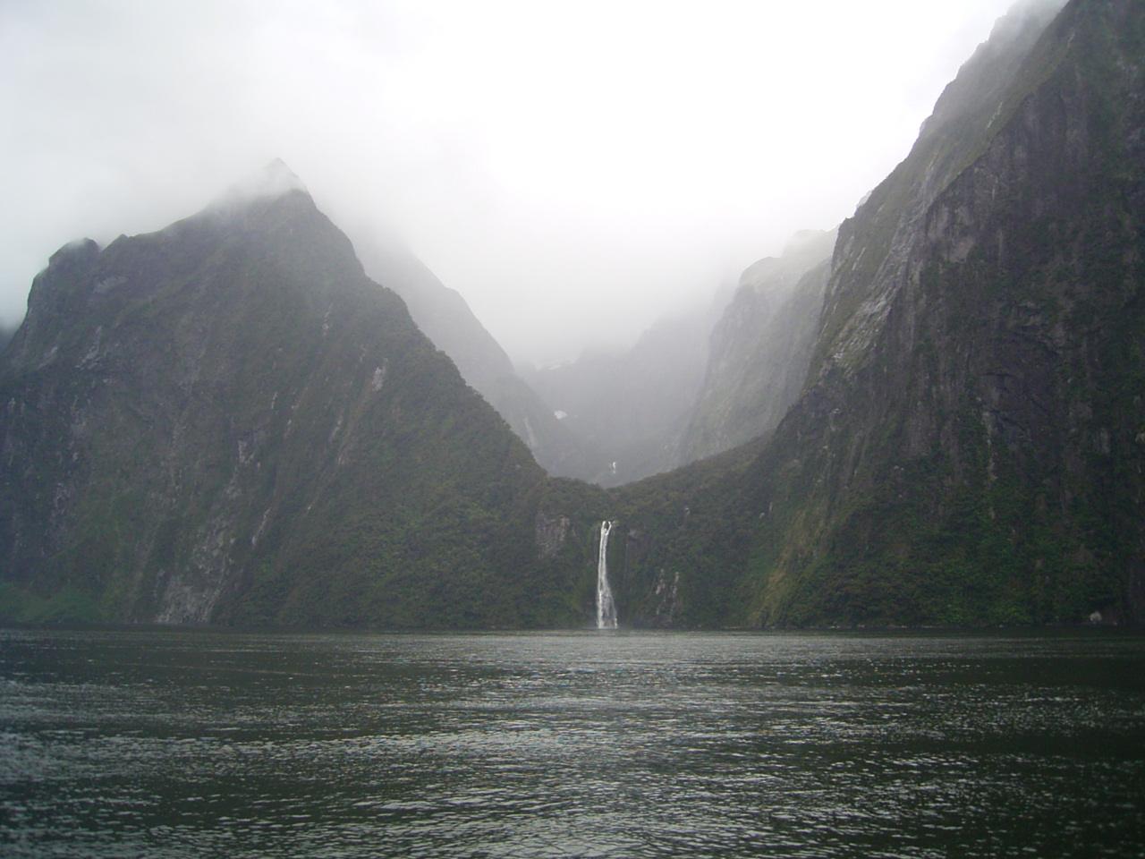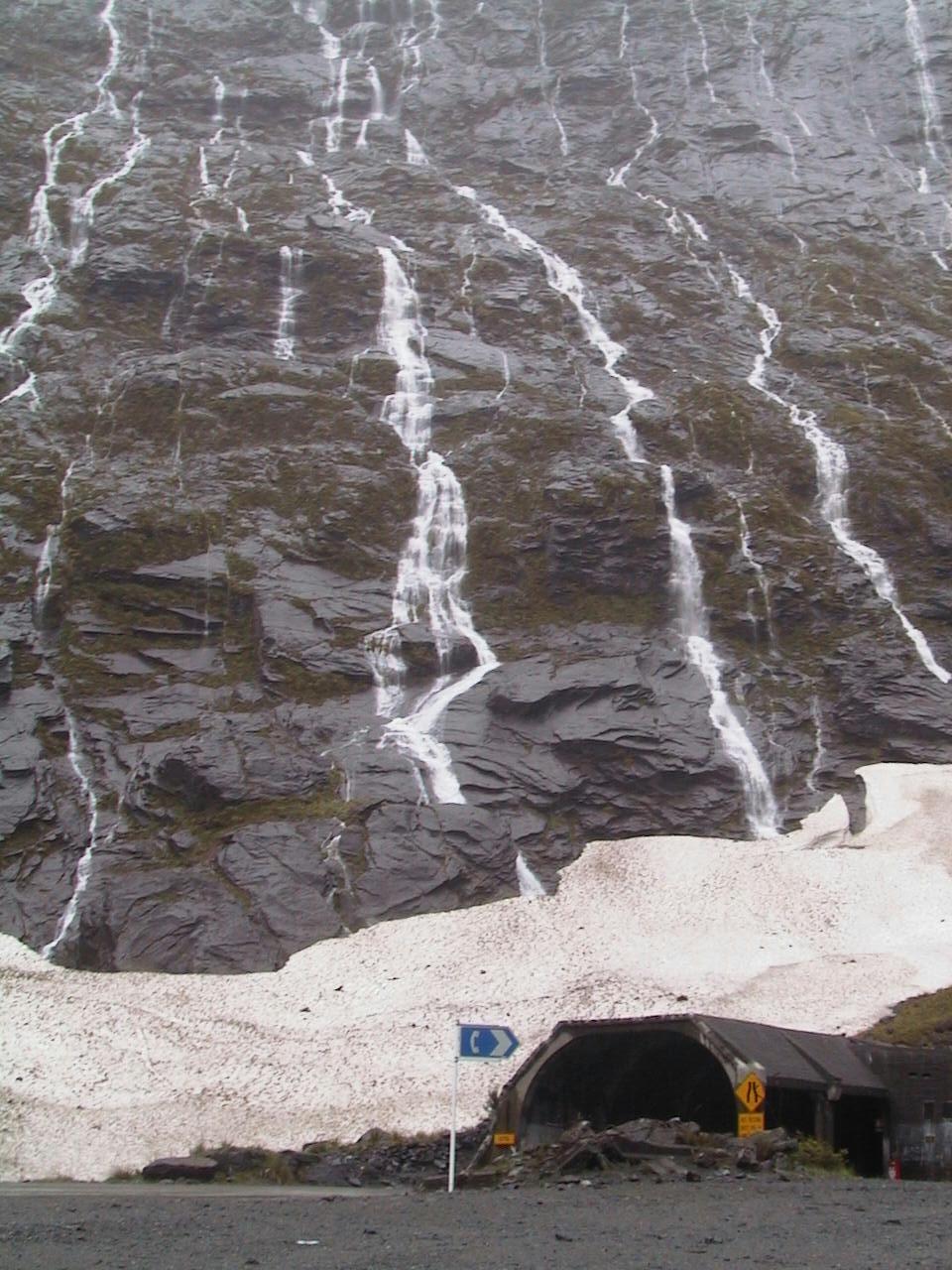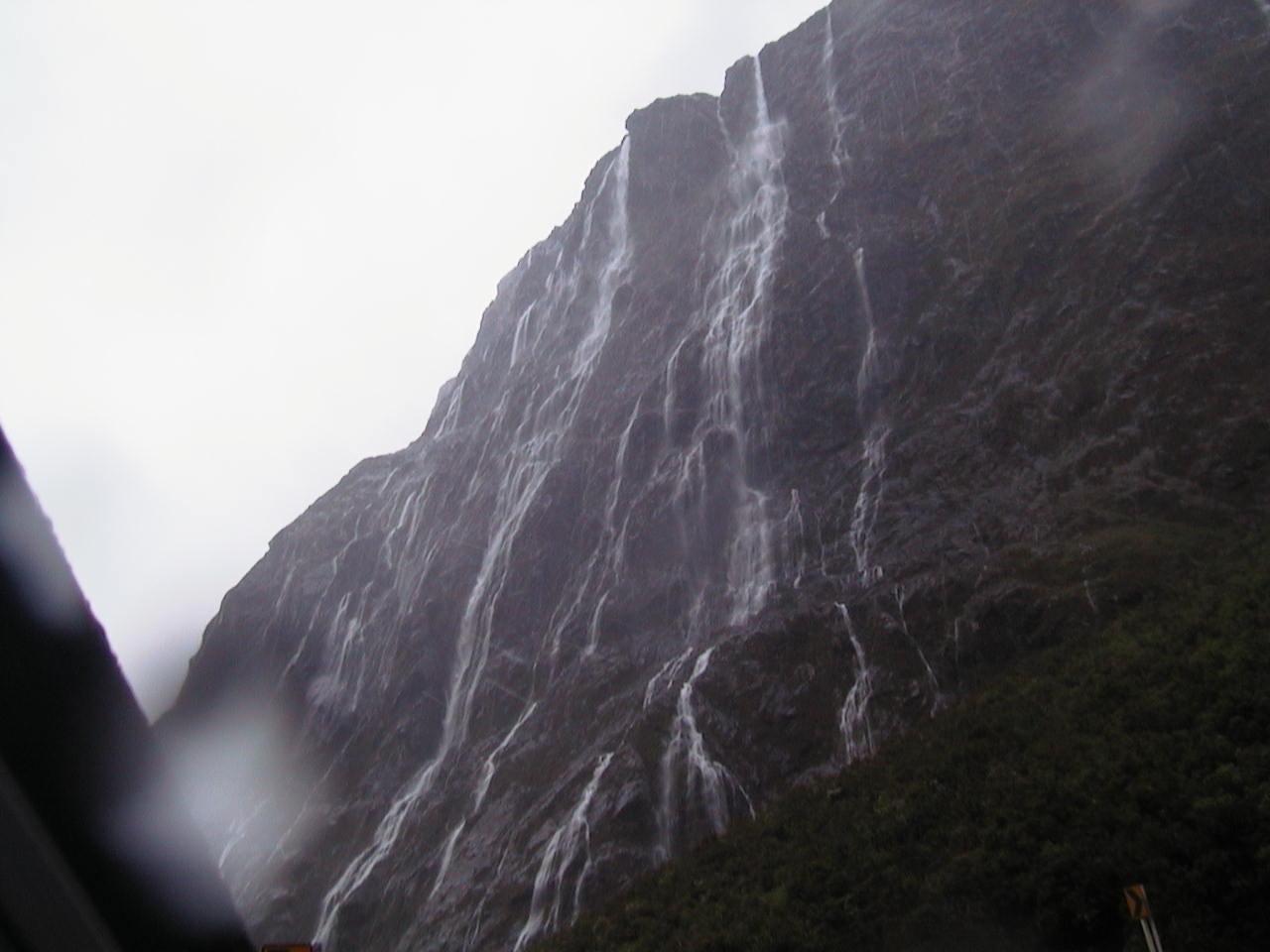 この景色をみると雨のミルフォードが良いのも分かります。晴天も良いですが、岩肌を白い流れが行く筋もできるすがたもすばらしいです。