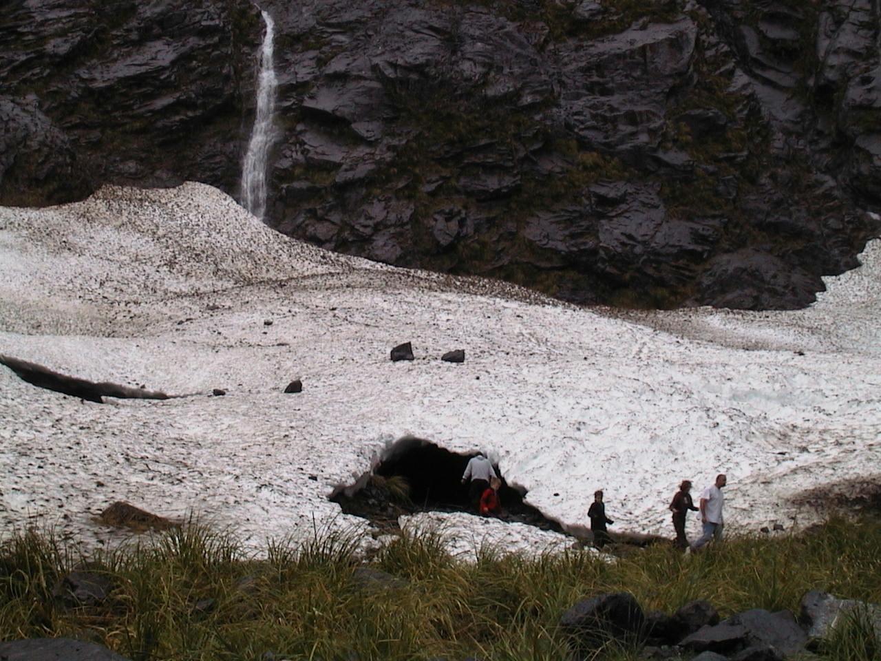 近づくと雪渓は思ったよりも大きく、小さく見えた穴はトンネルになっていて入っていけた。