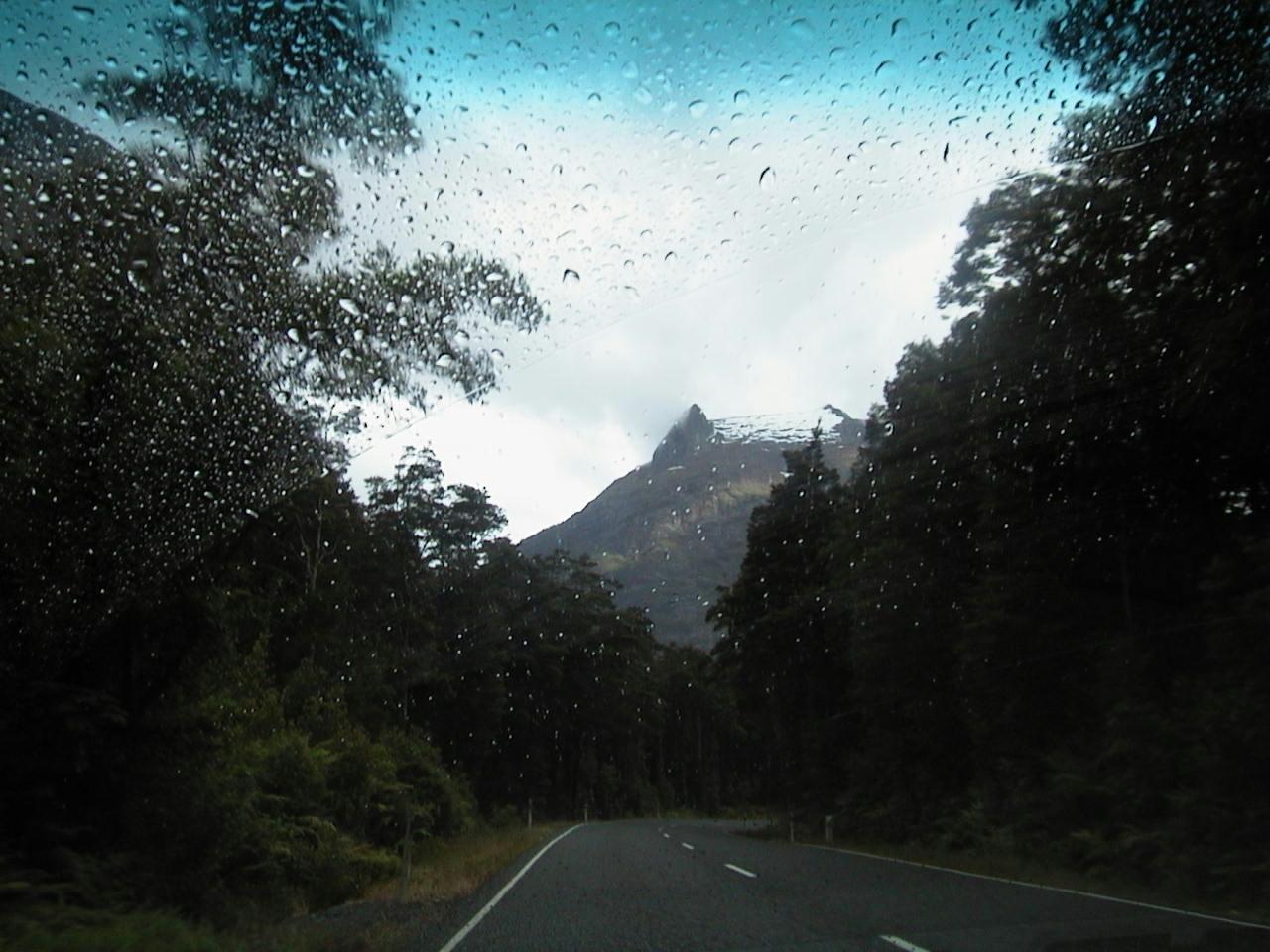 まさにフィヨルドというU字谷の絶景が広がっていた。思わず「オー」なんて声をみんなであげてしまった。しかし車が停めるところを見つけられず写真はかなり過ぎてもうすぐミルフォードサウンドの船着場に着こうかという場所、この辺から雨が降り始めた。 -