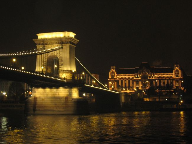 ドナウ川ナイトクルーズ。鎖橋のライトアップ。