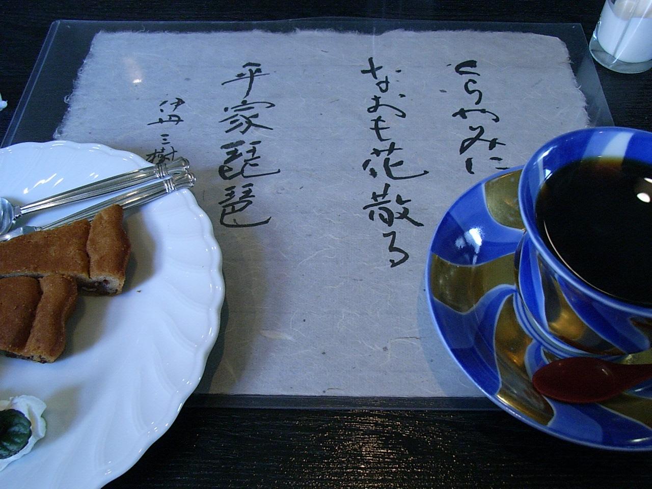 よく見なかったが、須磨寺には歌や句の碑が多数立っており、それらを書道の先生に書いてもらって、こちらの店のテーブルに置いてあるそうです。