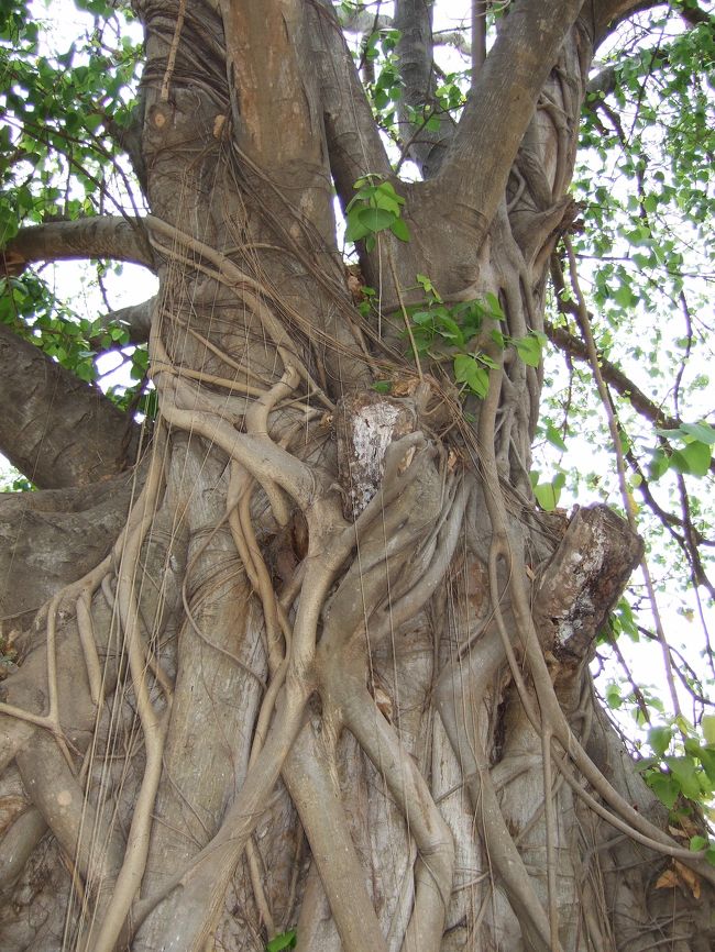 ビルマ軍の持ち帰りを逃れた仏頭が木の根に包まれています。