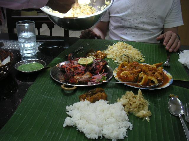 バナナの葉の上にご飯(白飯とターメリックライス)をのせてくれます。 -
