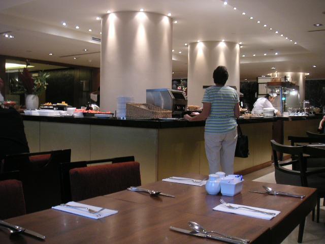 朝食バイキングの様子。日本食コーナーがあり、不思議な味の一口そばもありました。 -