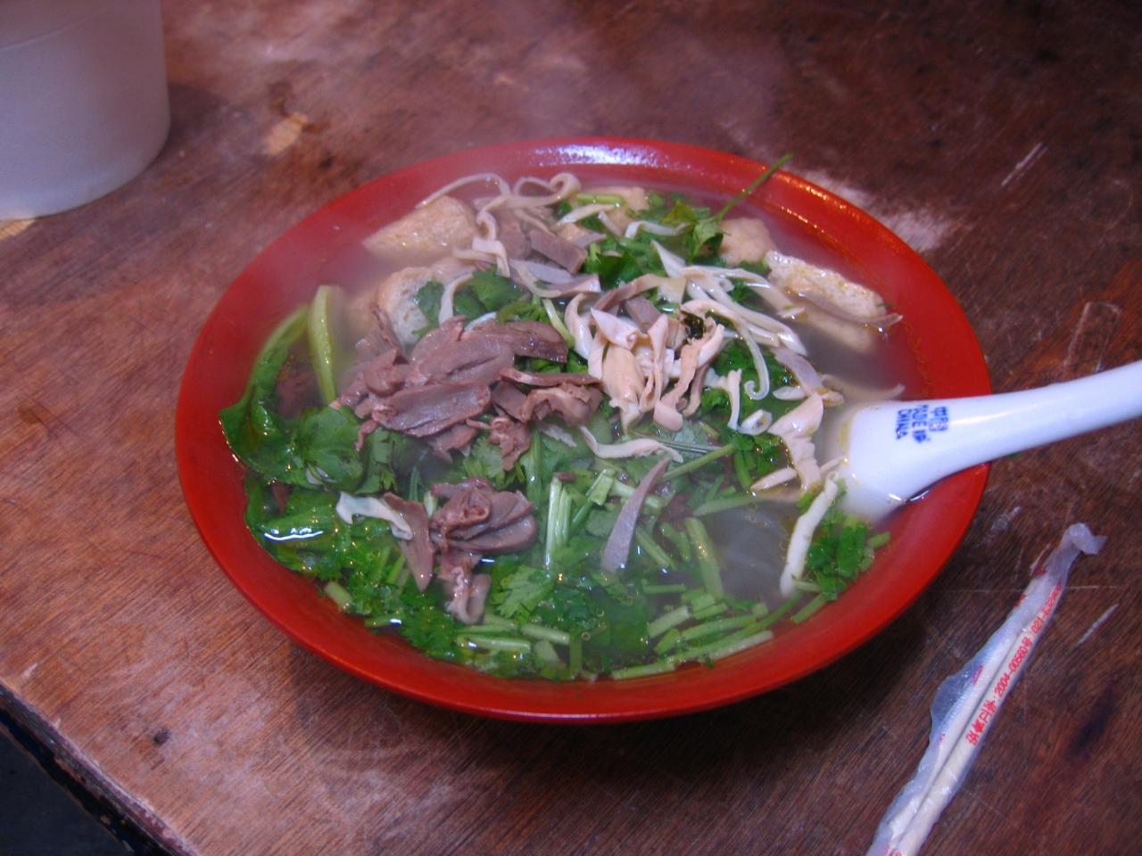 まずはスープを一口。ん〜うまい!あっさりしてるが何だか知らんが出汁が良く効いていて、なおかつ香菜のいい香りが鼻に抜ける感じがなんともいい。こいつは当たりだ。麺は太目の春雨といった感じ。麺の量が結構多くて一杯食べればお腹一杯。これでなんとたったの5元(75円くらい)。まさに満足の一杯。 -