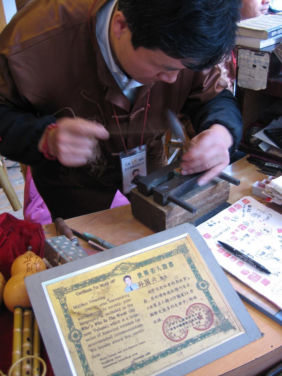 豫園周りの土産物屋。何やら怪しげな証明書を掲げながら、判子を彫っている。
