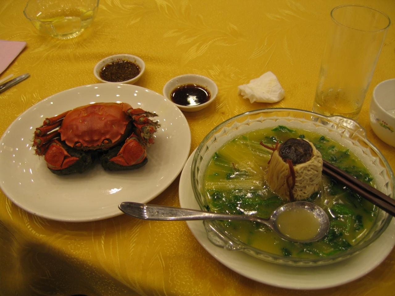 う〜んいい色に蒸しあがってる。さてお味の方は。ん、なんだこれ?身はともかく、このミソの味。日本で食べる蟹とは全くベツモノ。へぇ〜、面白い。こういう味してんだ〜と、一頻り感心しながら再び貪りつく。とにかくうまい。烏骨鶏の半熟卵とでも言おうかって、食べたことないけど、鶏卵の半熟卵を濃厚にした感じの味。実と絡めると一層うまい。こりゃいいわ。 -