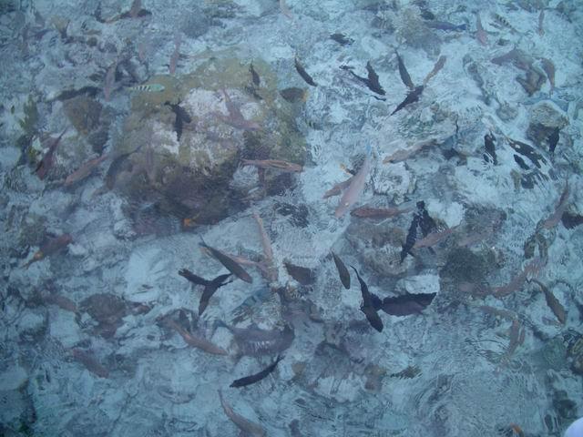桟橋脇の水際では毎日16:30からエイ(丸いタイプ)の餌づけが行なわれていて、スタッフに犬の様にまとわりつく大きなエイが可愛らしいです。エイ立ち泳ぎ状態。