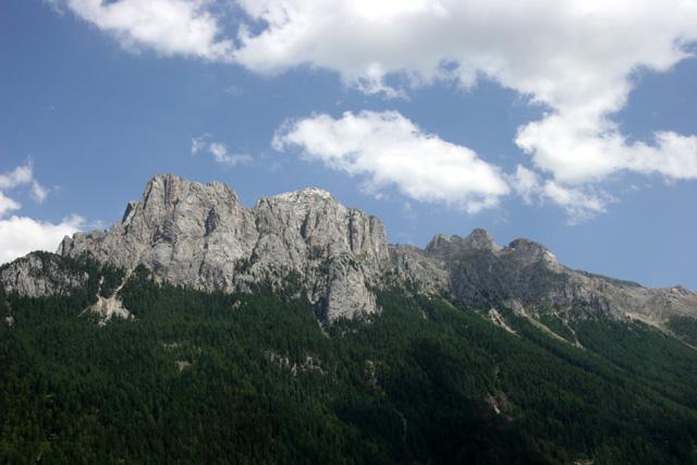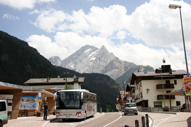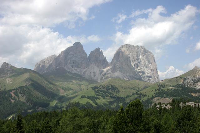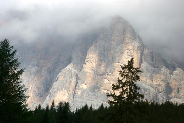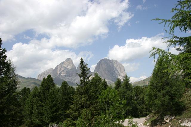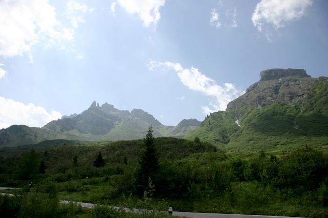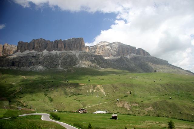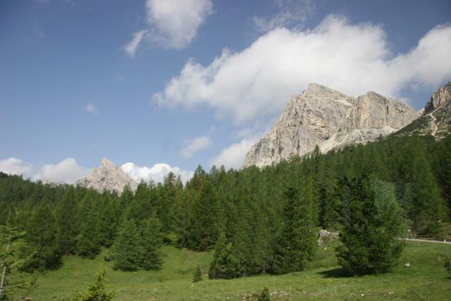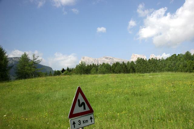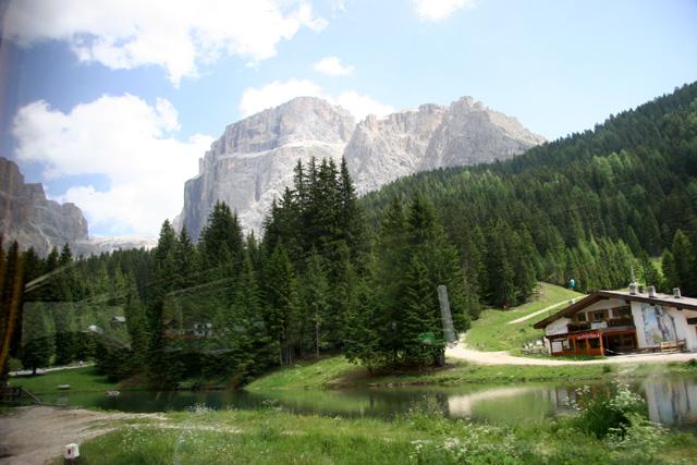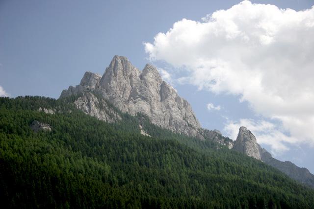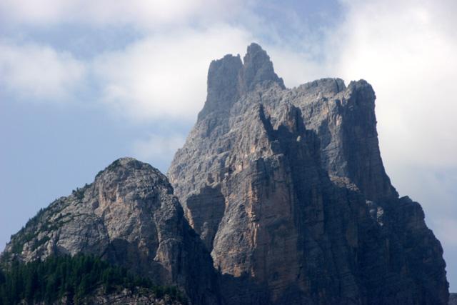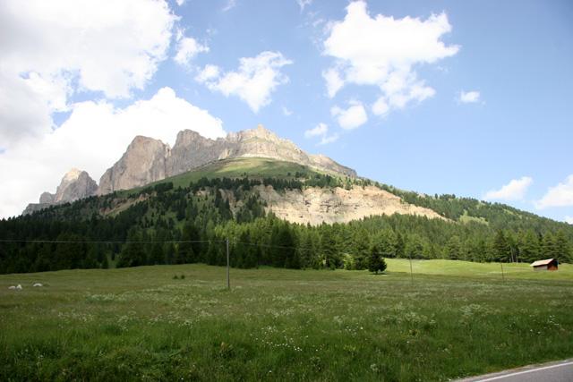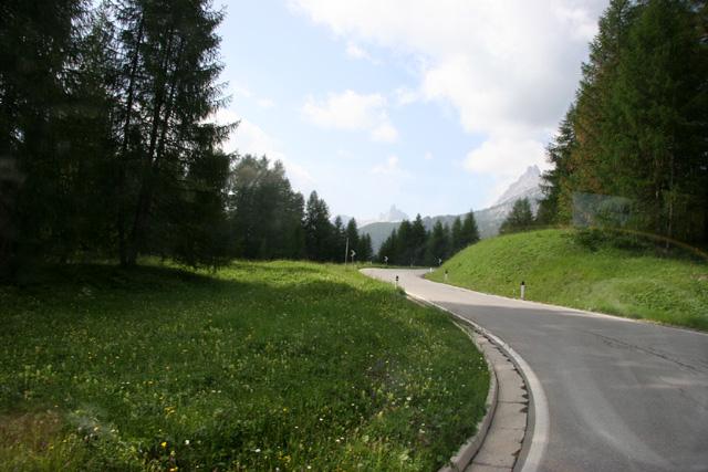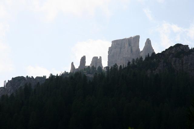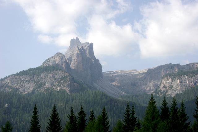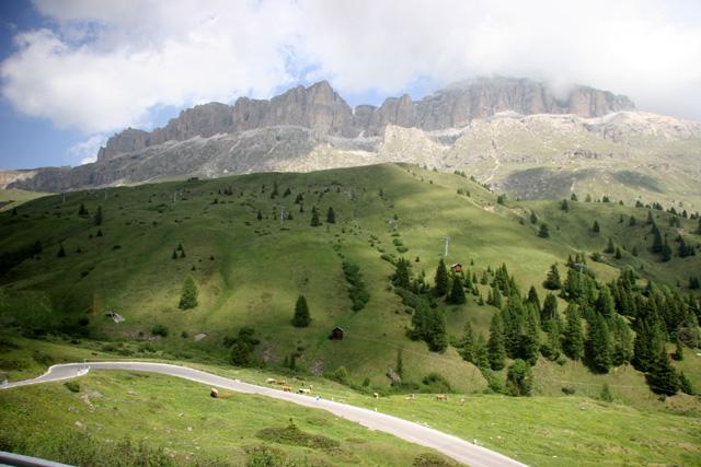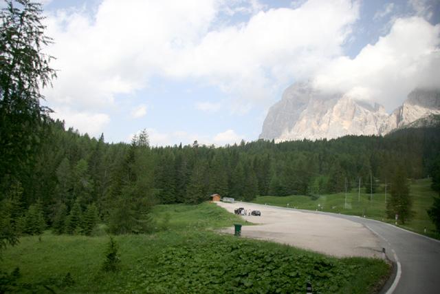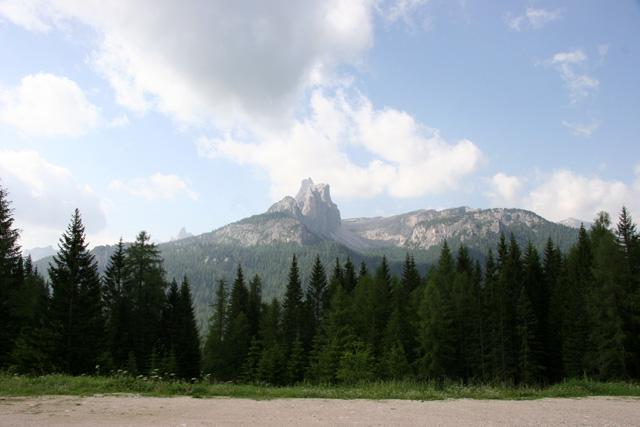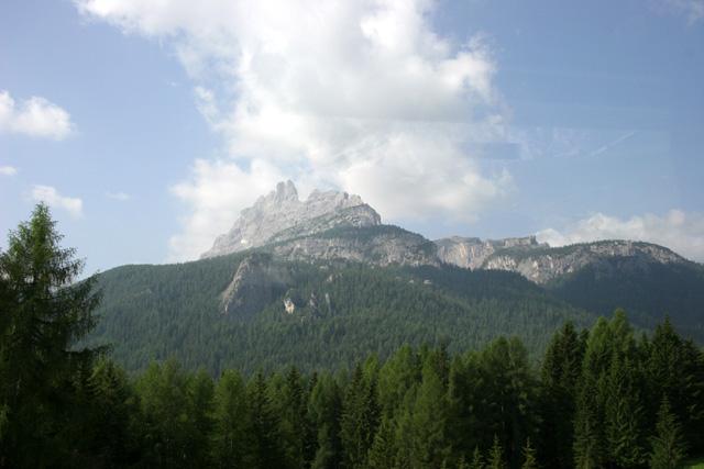 【ドロミテ街道を行く】・・コルチナダンペッツオを出ていよいよドロミテ本街道に入っていく。上下左右何処を見ても素晴らしい景色が続く・・。出発して40'走った所でチンクエ・トリ(5つの塔、2,137m)に出会う。他でもない昨夜の夕食はイタリアン・ピザを食べに行ったがそのお店のトレードマークがこのチンクエ・トリであった。テーブルナプキンにもその絵が描かれていた。特徴のある岩峰でドロミテでも親しまれているようだ。